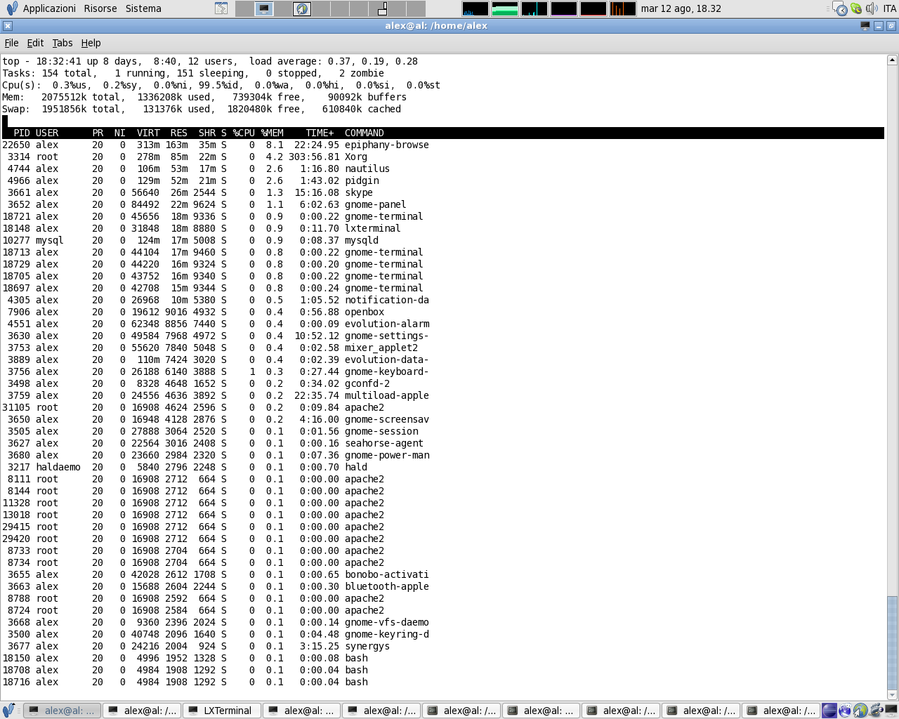 Perciò, anche se non occupa molta meno RAM di gnome-terminal (circa 1.5 o 2 MB in meno), il vantaggio lo vedrete quando ne aprirete diverse finestre. Come potete vedere dallo screenshot di top, qui a fianco, 5 finestre di lxterminal occupano 17 MB (meno 8.8 condivisi, quindi 9.2 MB), mentre 5 finestre di gnome-terminal occupano ognuna tra i 15 e i 18 MB, meno i 9.3 condivisi, sono tra i 5 e gli 8 MB ognuna, per un totale di 25-30 MB circa.