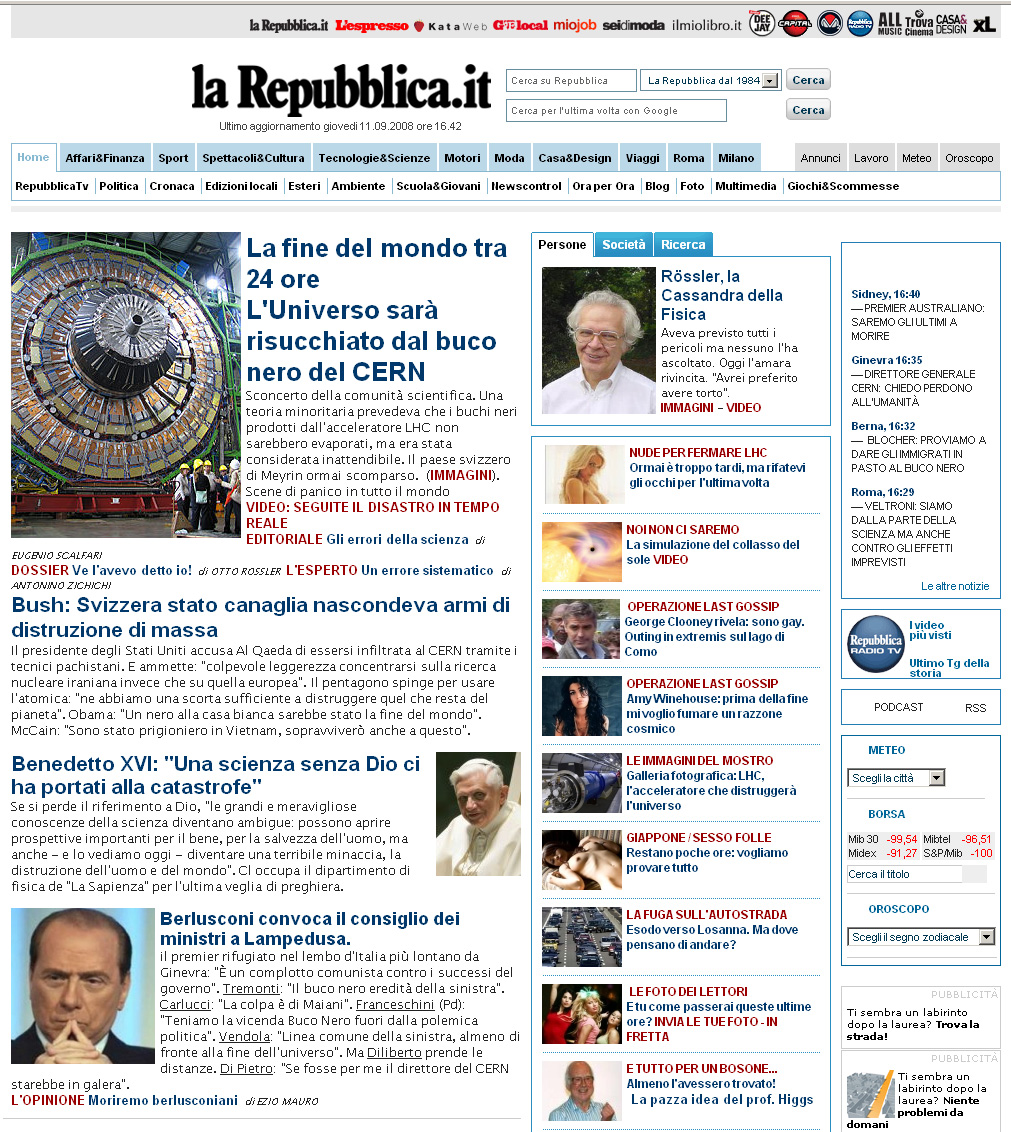 E nel caso non finisse il mondo, spero che riescano a miniaturizzare l'LHC, diciamo sull'ordine dei 27 cm (con le regexp è semplice: “s/k/c/g” :) ), così posso installarlo sulla macchina e sparare buchi neri quando c'è troppa coda.