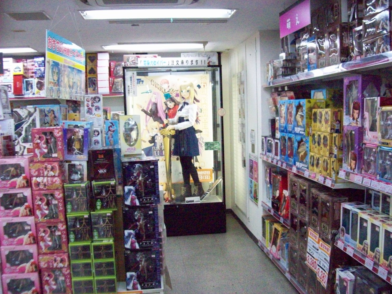 Anche qui abbiamo 6 piani di roba, divisi diligentemente. Al primo piano sono in esposizione alcune rarità/antichità (che vedete, parzialmente, nella vetrina della foto), al secondo ci sono accessori da cosplay, al terzo il reparto “per donne” (shojo, J-POP, ecc.), al quarto quello “per uomini” (shonen), poi quello generico (soprattutto artbook e manga) e modellini, action figure, ecc.